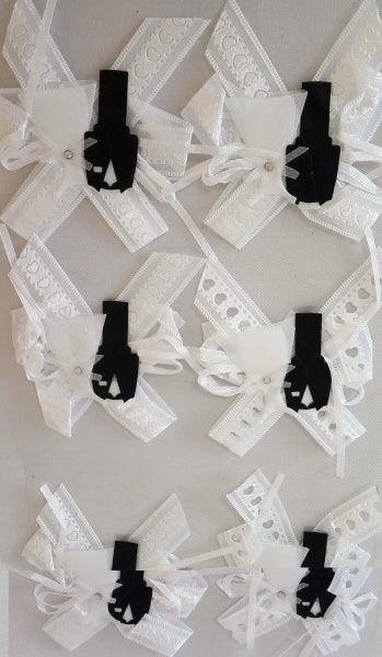 Aceste accesorii elegante de nuntă sunt perfecte pentru a adăuga un strop de rafinament și stil evenimentului tău special. Setul conține 6 bucăți de accesorii autoadezive, fiecare fiind meticulos lucrată pentru a completa cu eleganță ținuta mirilor.