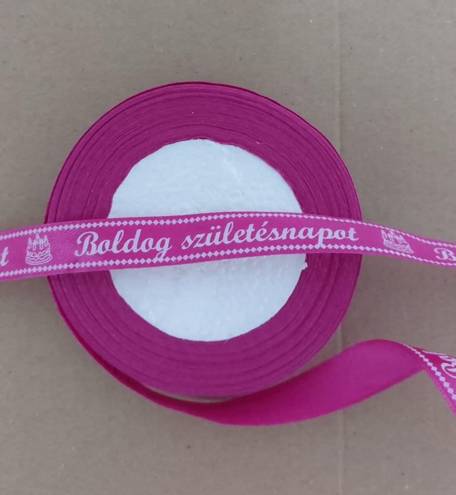 Banda decor saten 1.5cmx25y Boldog Szuletesnapot ciclam