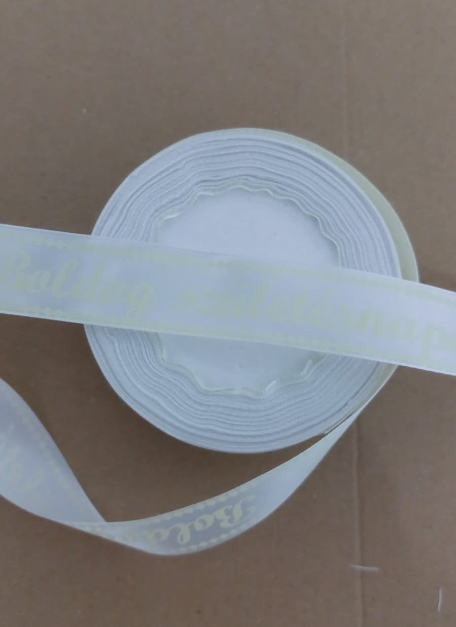 Banda decor saten 2.5cmx25y Boldog Szuletesnapot alb