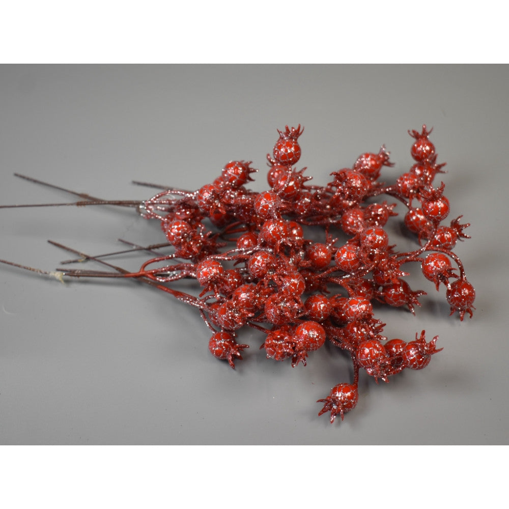 Adaugă un strop de culoare și strălucire aranjamentelor tale cu acest pick decorativ cu măceșe roșii acoperite cu glitter fin. Cu aspect natural și accente sclipitoare, este ideal pentru decoruri de toamnă, iarnă sau sărbători, oferind un plus de farmec și eleganță rustică.