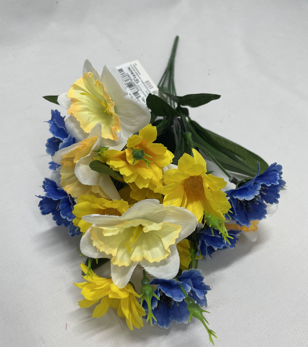 Buchet decorativ de primăvară, cu flori artificiale atent realizate, în nuanțe vesele de galben, ce aduc un plus de lumină și prospețime oricărui spațiu. Ideal pentru decorarea locuinței, biroului sau pentru aranjamente florale tematice de sezon.