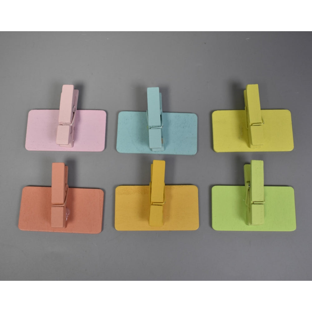 Set de tăblițe cu cleme, 6 bucăți/pachet, în culori mixte, ideale pentru realizarea aranjamentelor decorative. Pot fi folosite pentru fixarea etichetelor, mesajelor sau elementelor mici în aranjamente florale, candy bar, evenimente festive sau decoruri tematice. Practice și ușor de utilizat, aceste tăblițe adaugă un plus de creativitate și personalitate oricărui decor.