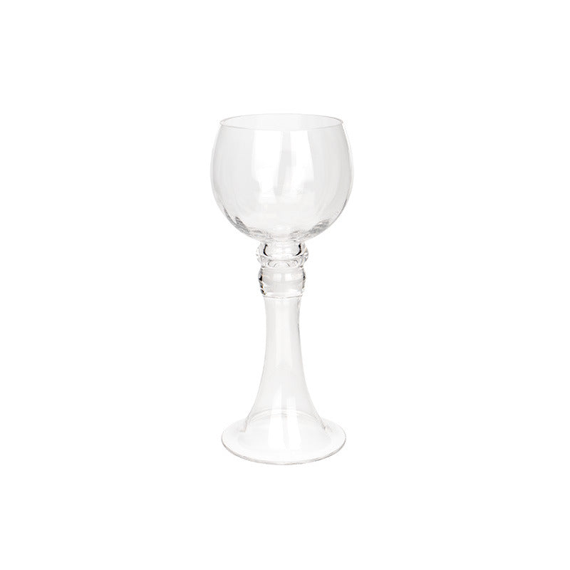 Această elegantă piesă de 30cm în înălțime, cu un diametru exterior de 11cm, aduce un strop de rafinament și stil oricărui decor. Realizat din sticlă de cea mai bună calitate, potirul pe talpă este atât o piesă decorativă remarcabilă, cât și un recipient practic pentru diferite aranjamente florale sau accesorii decorative.