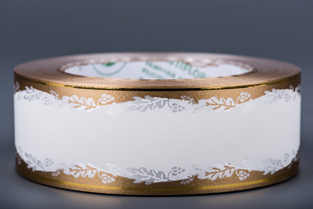 Această bandă decorativă funerară de 4cm x 50y în alb și aur este un element delicat și solemn, perfect pentru a adăuga un plus de eleganță aranjamentelor florale și decorurilor funerare.